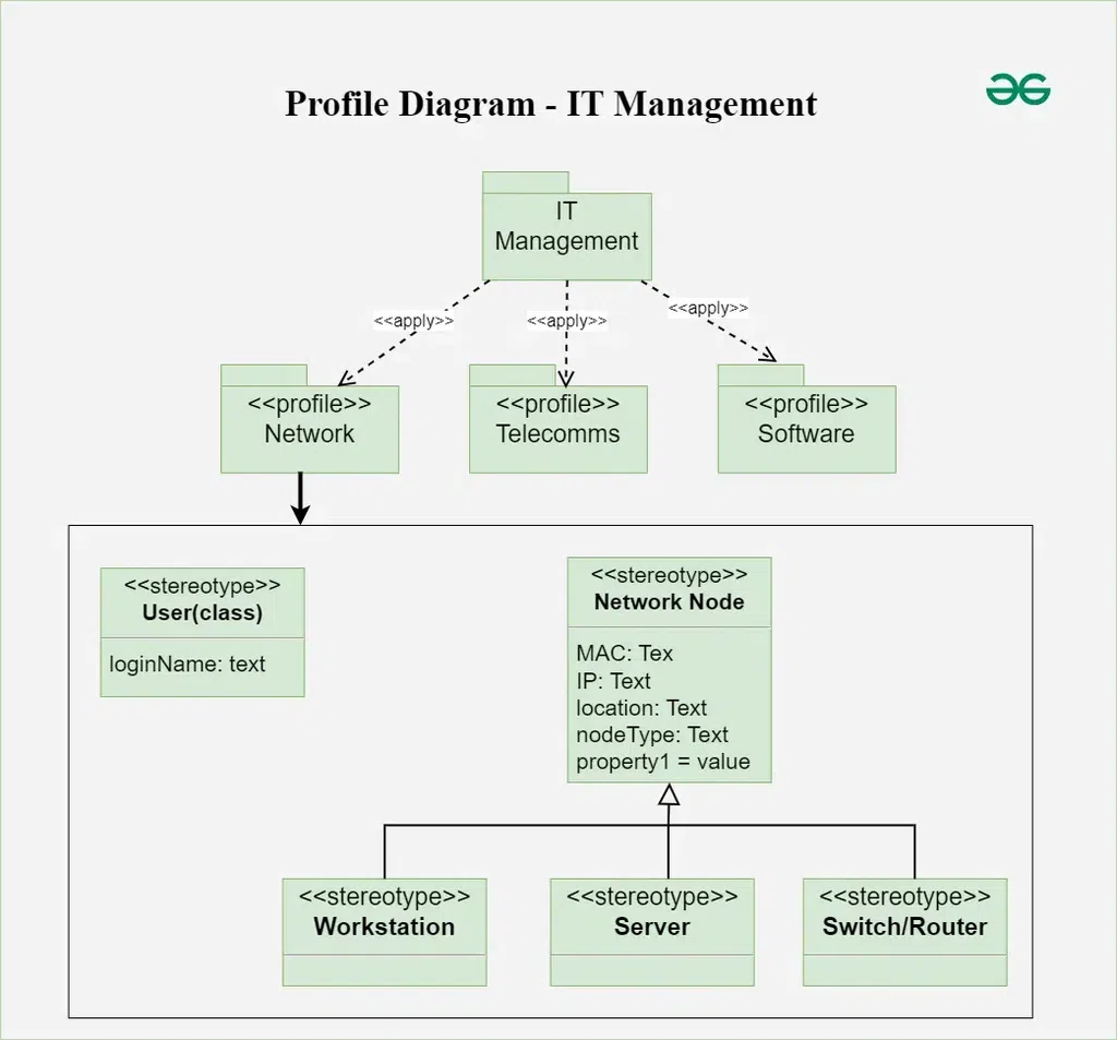 märgistatud väärtustest, piirangutest ja laiendustest. Profiil on peamine konteiner diagrammil mis kujutab stereotüüpide, märgistatud väärtuste ja laienduste kogumiku. See on laienduse mehhanism, et kasutada UML konkreetse eesmärkide jaoks. Stereotüübid defineerivad uued tüüpi mudeli elemente või kohandavad olemasolevaid. Nad on tähistatud kasutades külgsuunas