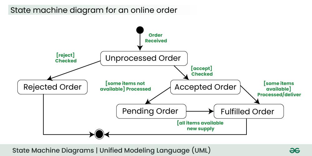 koosneb esialgsest olekust, üleminekust, olekust, harusmärge, liitumismärge, eneseüleminekust, komposiitolek ja lõpp olekust. Esialgne olek on must täidetud ring, mis näitab esialgset olekut süüstemil või klassil. Üleminekul kasutatakse kindel nool, et näidata üleminekut või kontrolli muudatust ühest olekust teise. Nool on märgistatud